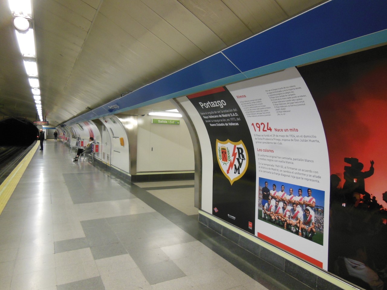 A farmi cambiare repentinamente idea fu la fermata Portazgo: la parete della banchina era composta da un insieme di pannelli dedicati alla locale squadra di calcio del Rayo Vallecano. Saltai giù dal treno appena si aprirono le porte e mi diressi verso le scale, seguendo le indicazioni per lo stadio. Lungo le pareti del sottopasso c’erano, impresse in tinta biancorossa, espressioni quali “valentía, coraje y nobleza” oppure “alabí alabá”. Era molto forte l’attaccamento di quel quartiere alla propria squadra di calcio: lo stadio era lì in mezzo ai palazzi, come un tempio sacro al centro del villaggio. Entrai nello store ufficiale del Rayo Vallecano, situato a ridosso dei cancelli dello stadio.