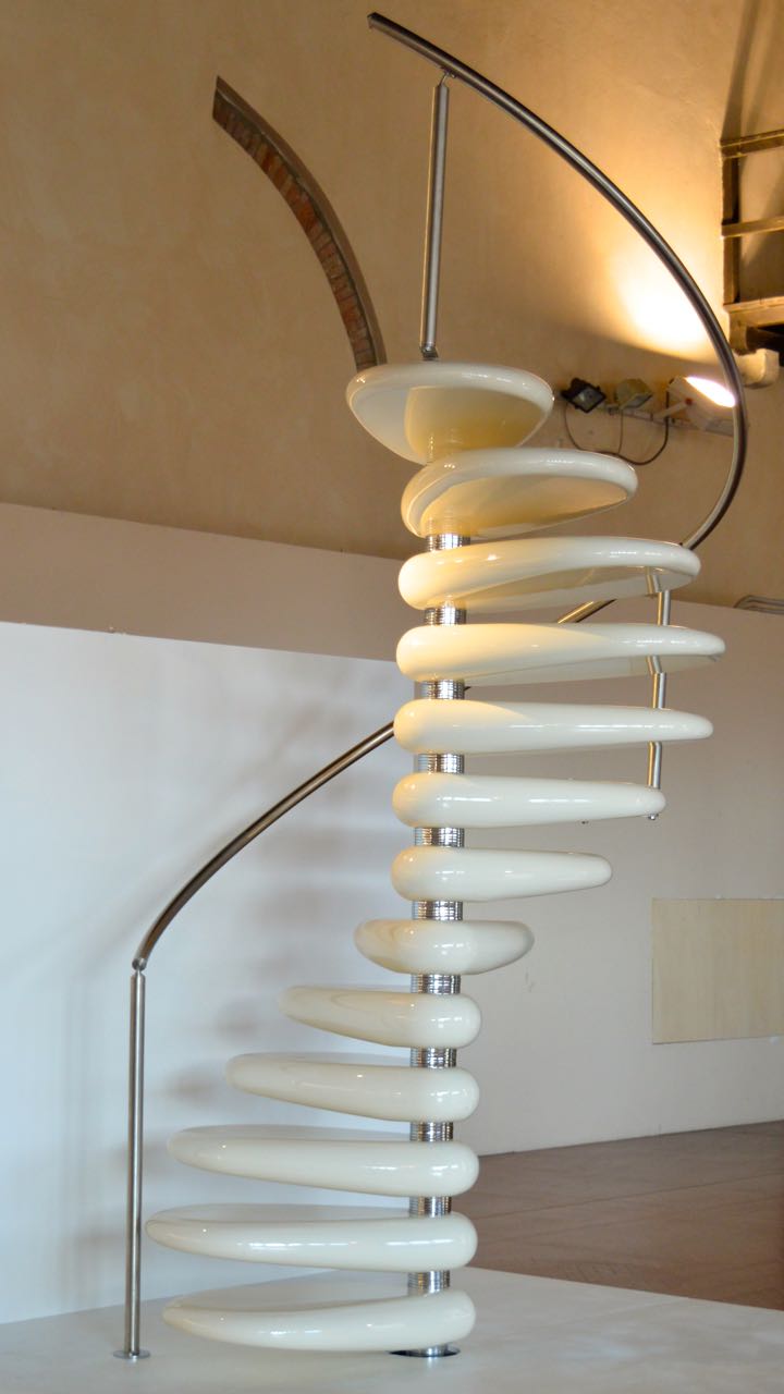 In mostra ci sono magnifici oggetti di arredo. C’è appunto il sofà Tatlin progettato per Edra sul volgere degli edonistici anni Ottanta. L’ispirazione arriva dalla torre di Tatlin, emblema del costruttivismo il cui modello di legno è conservato nel museo Beaubourg di Parigi. Ne nasce un totem da salotto, assolutamente perfetto per spazi pubblici. Del resto lui stesso spiega che “il design d’autore in Italia nasce da una felice contaminazione fra il linguaggio dell’arte e il design” e il suo lavoro non è altro che “una rilettura tridimensionale di alcune opere d’arte”. Completano l’esposizione progetti di design che hanno segnato la storia della progettazione di interni come le poltroncine Chiocciola, la chaise longue Paolina, la scala a chioccola bianco latte Rolling e altri ancora.